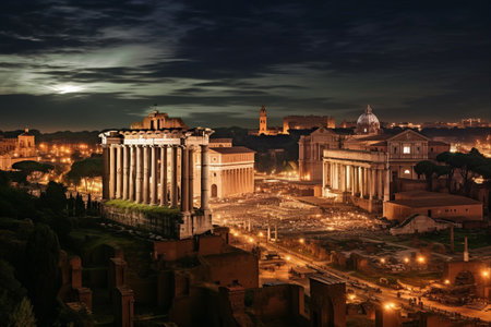Rome Forum with ruins of ancient architecture at night. Italy.