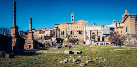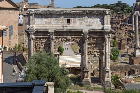 ROME, ITALY - JUNE 23, 2017: Ruins of Septimius Severus Arch and Roman Forum in city of Rome, Italy