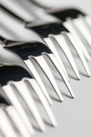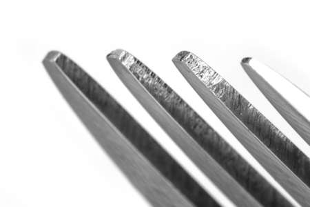 Selective focus closeup macro metal shiny forks lined up over white background.