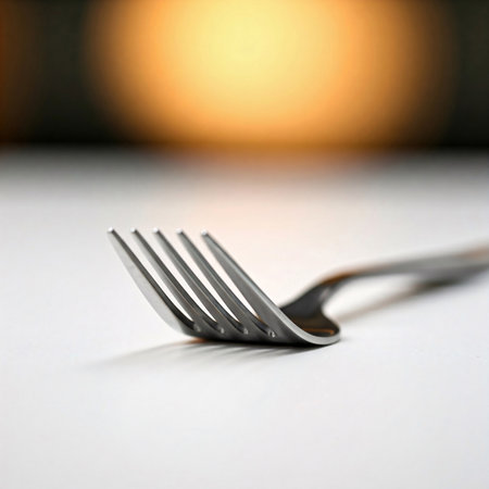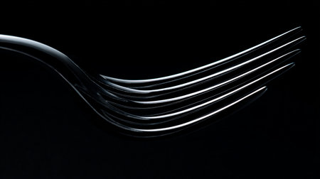 A single, elegant fork rests on a cool, reflective steel surface, its polished tines catching the subtle light.