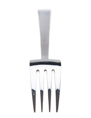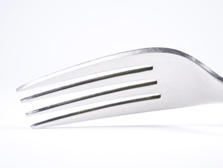 Silver fork utensil macro with shallow DOF isolated on white background with copy space.