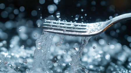 A fork is submerged in water, creating a dynamic splash with sparkling droplets around it