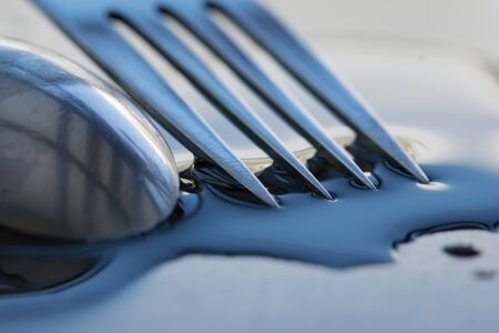Metal spoon and fork on an organic large water drop on a clean light blue surface that reflects the color of the sky close up.