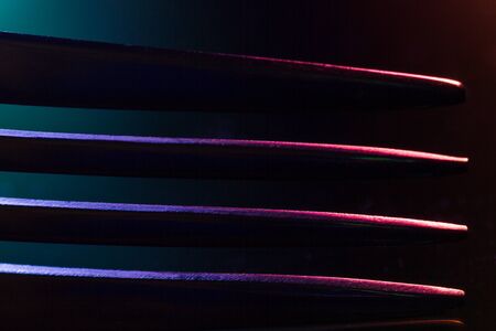 Prongs of one fork in colorful illumination macro shot creating an abstract composition. Image is suitable as a background.