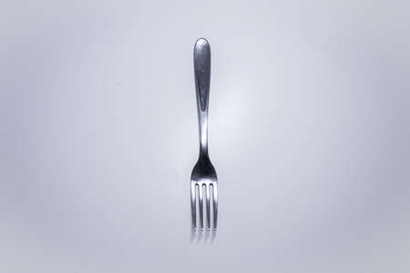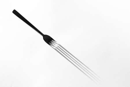 Silver fork with shadows of the prongs facing in the opposite direction on a white background in landscape format with copy space
