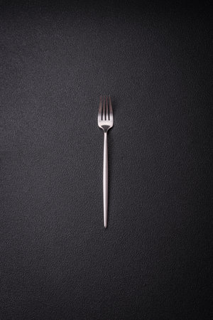 Kitchen fork made of steel on a dark textured background. Kitchen utensils on the table
