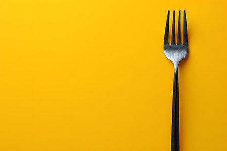Stainless steel fork against a bright yellow backdrop, offering a modern and minimalist design. ideal for themes related to kitchen, dining, culinary arts, and restaurant branding. perfect for use in print, posters, and digital media. Generative AI
