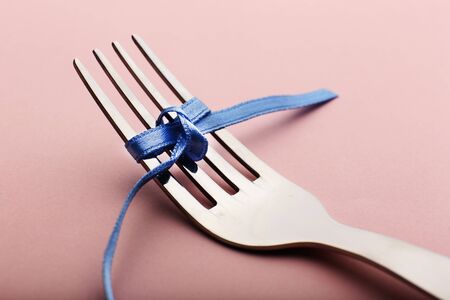 Female hand holds a fork on blue pastel background. Top view. Studio shot