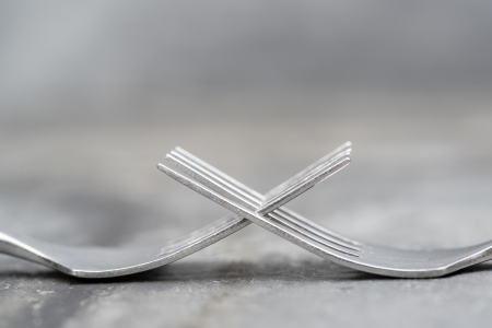 part of a white plate and two forks on the edge of one upside down with the teeth of the other down the table background