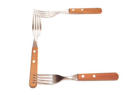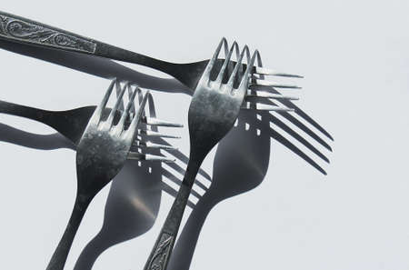 Stainless steel forks crossed on white background with copy space – Shiny silver kitchen tools used for eating