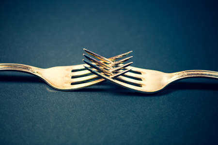 Two forks in colorful illumination macro shot creating an abstract composition. Image is suitable as a background.