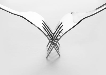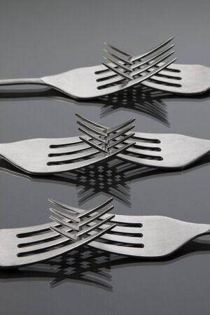 luxury two shiny silver metal fork for food dinner reflection still life on white background