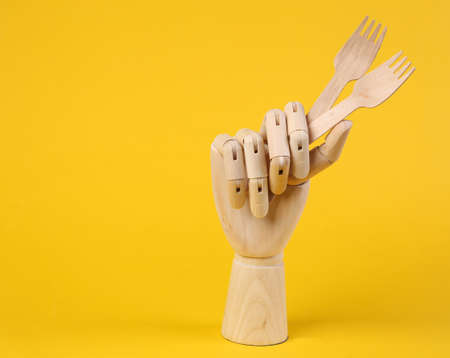 Wooden disposable fork on a gray background close-up. Environmentally friendly product.