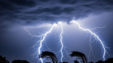 Multiple powerful lightning strikes illuminate a dark, stormy night sky above silhouetted trees.