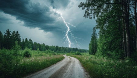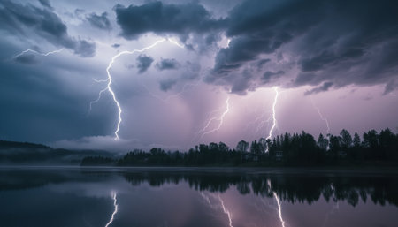 AI Generated. Dramatic lightning strikes illuminate dark storm clouds over a landscape during a nighttime thunderstorm