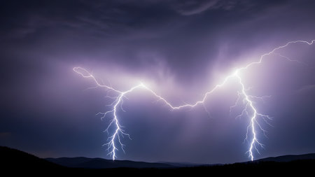 Powerful bolts of lightning light up the dark clouds over the mountains as a storm approaches at twilight.