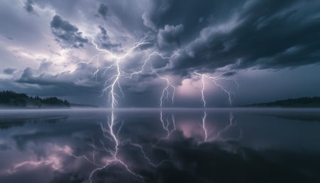 lightning reflection on a calm lake with surrounding mountains, created with generative ai