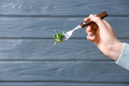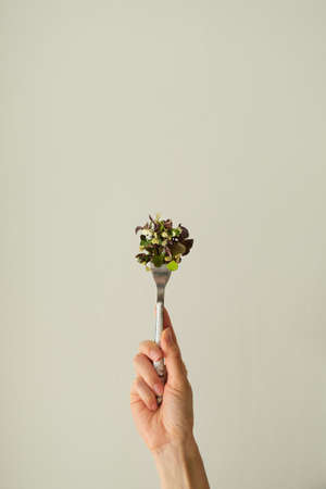 Beautiful woman with tomato and green on a fork in her hand is isolated on a gray background. Place for text. Fork with vegetables in focus and close-up.
