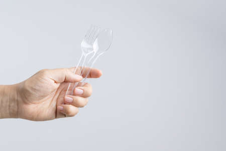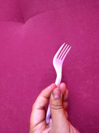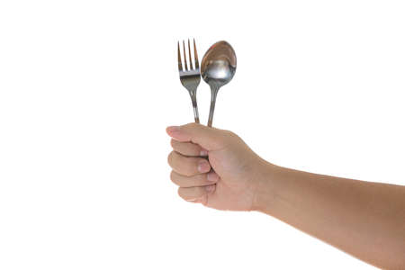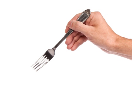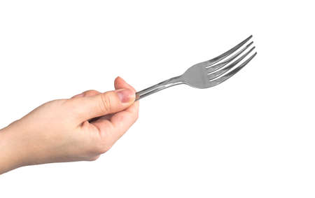 Hand of an adult male holds a metal fork. Stainless steel fork in his left hand. Middle-aged man of European race. Kitchen utensils.