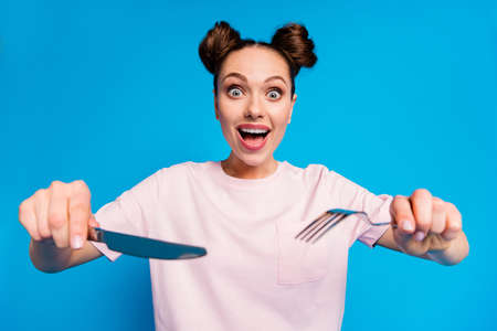 Photo of pretty funny hungry lady two funny buns hold metal fork knife wait tasty meal cutting pieces excited dinner start wear casual pink t-shirt isolated bright blue color background