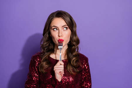Closeup photo of pretty lady party event hold metal fork waiting dream of holiday dinner beginning wear sequins burgundy dress isolated pastel violet color background
