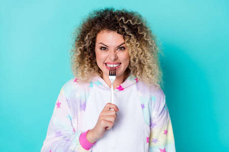 Portrait of attractive hungry crazy wavy-haired girl biting fork healthy meal isolated over bright teal turquoise color background