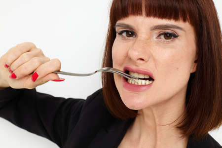 portrait of a woman in a black jacket a knife and a fork near the face Lifestyle unaltered