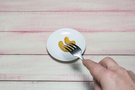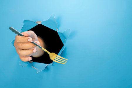 A human hand is holding a fork through ripped paper. Hand gestures to reach or grab food. Mockup or Copy space