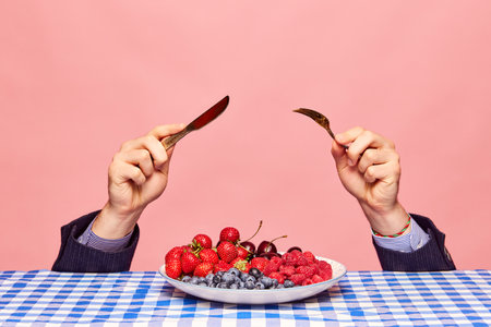 Male hands with knife and fork over plate with fresh berries against pink background. Vitamin mix