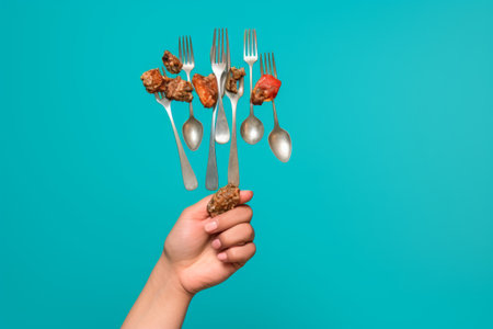Spoonfuls of Creative Connectivity: A Collage Illustration of Hands Eating Pork and Embracing Social Media Like Icons on a Turquoise Background