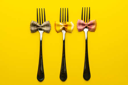 White and black plastic forks on a yellow background. The global problem of environmental pollution. Copy space. flat lay minimalism