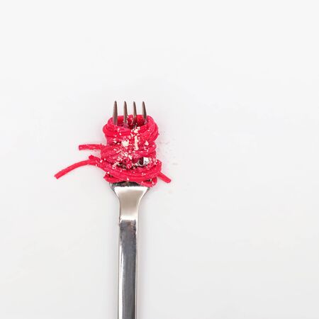 A close-up of a hand wearing a red cardigan holding up fork , isolated against a red background. Merry Christmas.