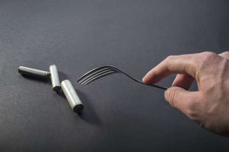 concept of excessive energy consumption. A hand uses a fork with batteries from a plate. Energy food
