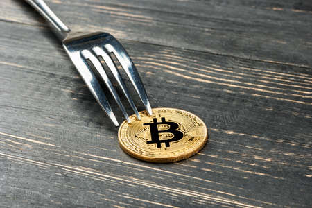 Gold bitcoin coin with fork on wooden background