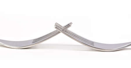 Two shiny forks cross on white surface