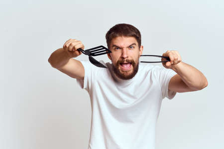 A man with kitchen appliances in the hands of their white T-shirt on a light background cropped view
