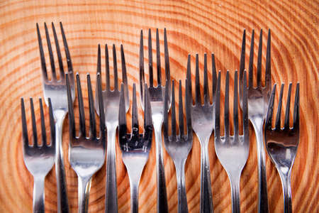 Old dinner forks on a wooden background