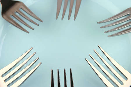 abstraction from table kitchen forks on a plate in a blue circle of color. forks scraper on the surface of the plate