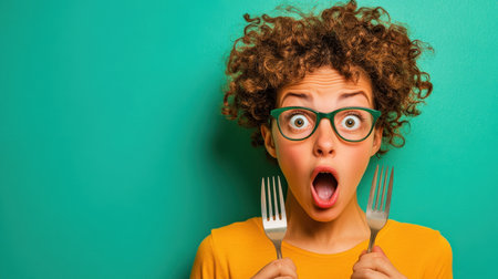 A young person with expressive eyes and curly hair holds two forks while showing surprise. The vibrant green backdrop enhances the joyful anticipation of food.