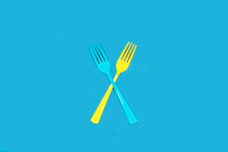 Disposable blue and yellow plastic forks on a blue background with copy space