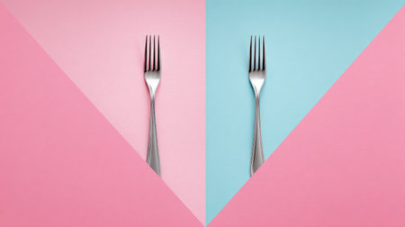 A sleek fork placed on a vibrant pink and blue background creates a striking visual contrast. This minimalist composition is perfect for culinary themes and table settings.