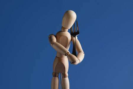 Wooden mannequin with fork on color background