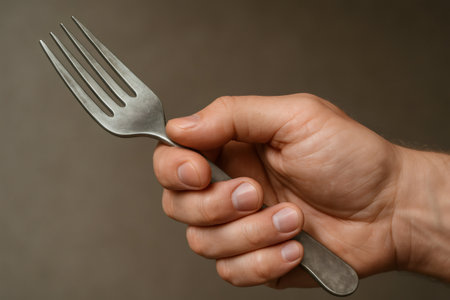 Human hand gripping a stainless steel fork against a plain background, ready for dining or food preparation
