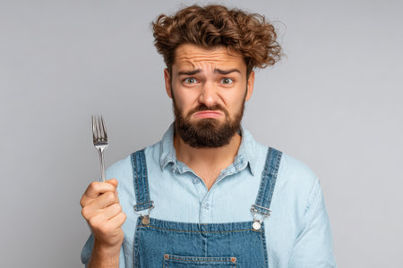 A man in a denim shirt makes a disgusted face after biting into spoiled food, holding a fork away. The background is a clean, neutral kitchen setting.