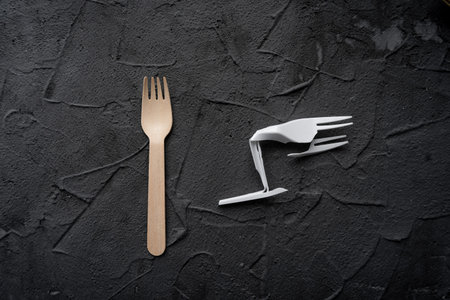 Flat lay photo comparison between disposable foam food container and plastic cutlery and reusable forks