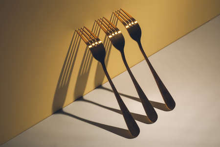 Closeup of shiny silver fork bunch. Many kitchen utensils.