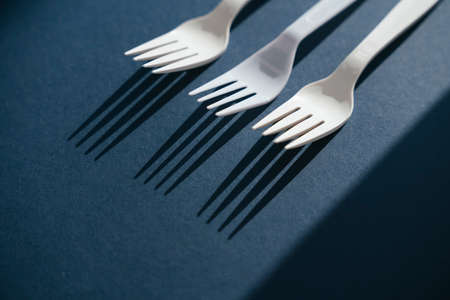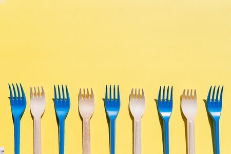 Disposable blue and yellow plastic forks on a blue background with copy space