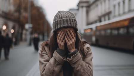 A woman in a city setting stands on the sidewalk, covering her face with her hands. The setting is a city street, with blurred buildings and people in the background.