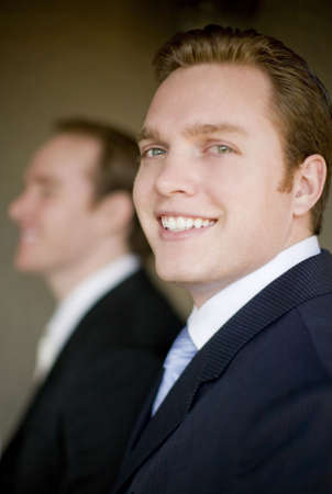 Side view of two businessmen in suits smiling