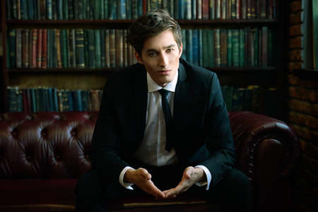 Handsome well-dressed young man by the bookshelves in a room with classic interior.